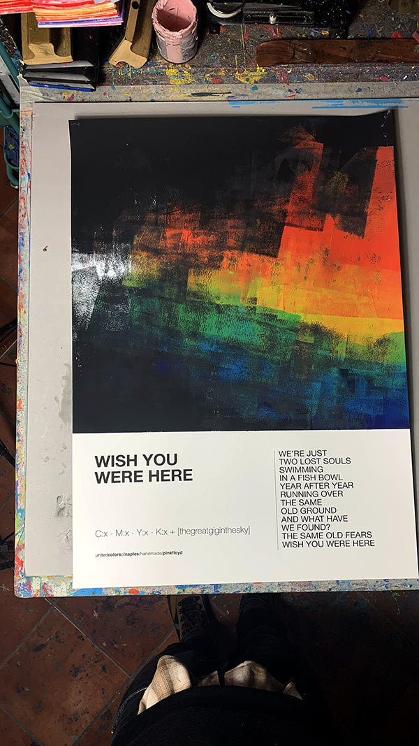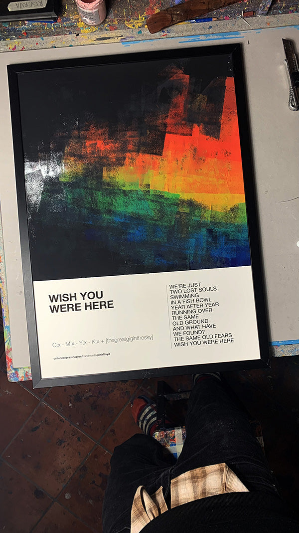 ie ikonische Zeile „Wish you were here“, eingefangen in kraftvollen Pinselstrichen, die aus der Dunkelheit leuchten, wird zum Ausdruck eines Gefühls, das jeder kennt: das Fehlen einer besonderen Person.